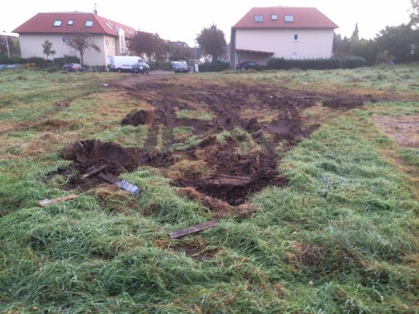 Wie auf unserem Bild ist nicht nur auf Lehm-, sondern auch häufig auf Rasenflächen kaum Tragfähigkeit gegeben. Nur zögerlich trocknen in den kommenden Tagen die Flächen ab, örtliche Schauer können bis zum Wochenende sogar noch für eine Verschlechterung der Oberflächenstruktur beitragen.