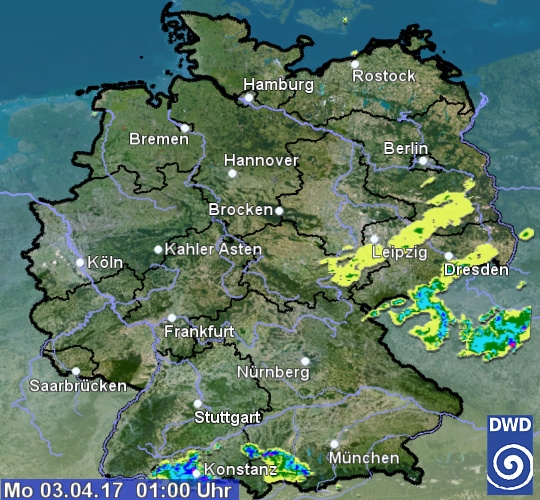 Das Radarbild zeigt aktuell am westlichen Bodensee und im südwestlichen Bayern noch einzelne Schauer- und Gewittersignale. Die Schauer über Sachsen sind mittlerweile schon nach Tschechien weitergezogen. Sonst ist es in Deutschland abgesehen vom Norden nur leicht bewölkt.