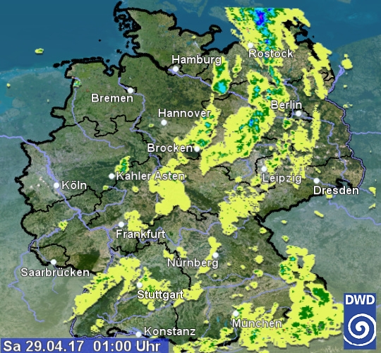 Das Radarbild zeigt aktuell noch einige leichte bis mäßige Niederschlagssignale im größten Teil von Deutschland verteilt. Lediglich im Nordwesten ist es trocken und teilweise klar.