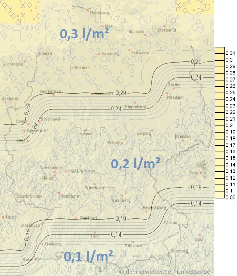 Am Sonntag kommt von Frankreich ein weiteres kräftiges Niederschlagsgebiet auf, dabei fällt zunächst verbreitet Schnee, der später aber unter Zufuhr milderer Luft meistens wieder in Regen übergeht. Es muss jedoch verbreitet mit erheblicher Glätte auf Straßen und Gehwegen gerechnet werden. Die Niederschlagsmengen liegen zwischen 5 und 20 Liter pro Quadratmeter. Lediglich im Nordosten des Landes bleibt es zunächst noch trocken.