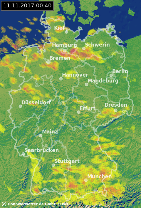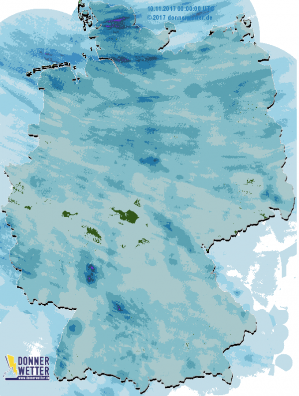 Das Radarbild zeigt aktuell gebietsweise leichte bis mäßige Regensignale im Süden und teils stärkere Schauersignale im Norden, die langsam Richtung Südosten wandern. Sonst ist der Himmel über Deutschland teils bewölkt, teils sternenklar. Vereinzelt haben sich Nebelfelder gebildet. Die Temperaturen liegen aktuell zwischen 3  und 9 Grad.