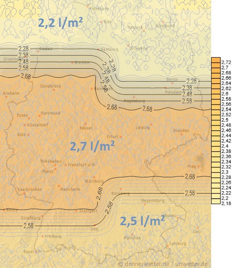 Am Montag überquert uns von Westen eine Kaltfront mit teils kräftigen schauerartigen und gewittrigen Regenfällen. Die Niederschlagsmengen liegen dabei zwischen 5 und 20 Liter pro Quadratmeter, örtlich auch mehr. Im Nordwesten bleibt es meistens trocken.