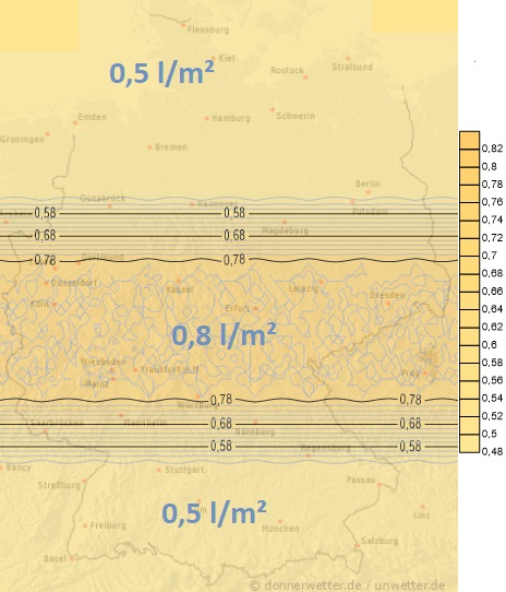 Am Mittwoch und Donnerstag fällt vor allem in der Nordhälfte gebietsweise noch leichter Regen, oder es kommt zu örtlichen Schauern. Dabei fallen an beiden Tagen oft nur noch Mengen zwischen 1 und 7 Liter pro Quadratmeter. Im Süden bleibt es in der Regel niederschlagsfrei.