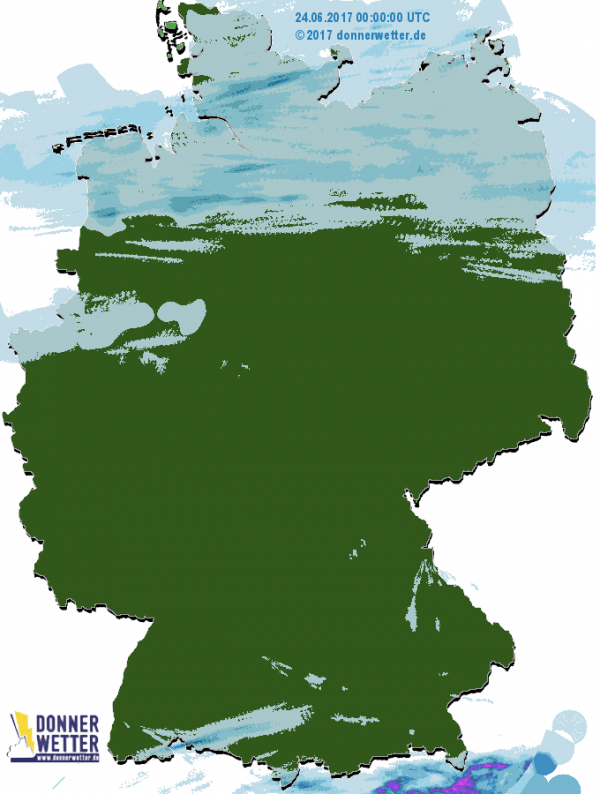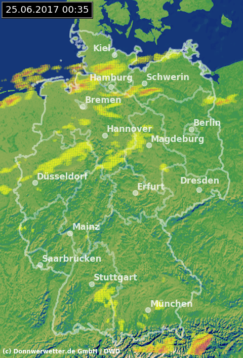 Das Radarbild zeigt aktuell einige leichte bis mäßige Signale in der Nordhälfte Deutschlands. Hier fällt gebietsweise Regen, oder Sprühregen. Über der Südhälfte ist der Himmel oft nur leicht bewölkt, oder sternenklar.