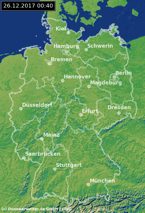 Das Radarbild zeigt aktuell keine Signale. Der Himmel über Deutschland ist im Norden und Westen eher wolkenverhangen, im Süden und Osten teils sternenklar. Gebietsweise haben sich dichte Nebelfelder gebildet.