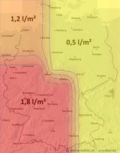 Heute verlagert sich der Regenschwerpunkt in die Mitte. Es kann verbreitet zwischen 10 und 20 Liter Regen / m² fallen, örtlich sind auch über 25 Liter / m² möglich. Abends zieht der Regen unter Abschwächung über die westlichen Landesgrenzen raus.