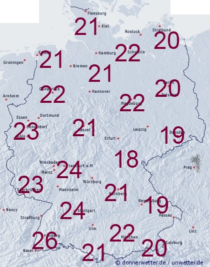 In Folge des warmen Sommerwetters der letzten Tage sind auch die Temperaturen im Erdreich wieder angestiegen. Allgemein liegen die Werte in Deutschland zwischen 20 und 24 Grad, am Oberrhein und am Bodensee werden mehr als 25 Grad gemessen. Etwas kühlere Werte von unter 20 Grad findet man regional in Nordostdeutschland, sowie in den Mittelgebirgen und Alpen.