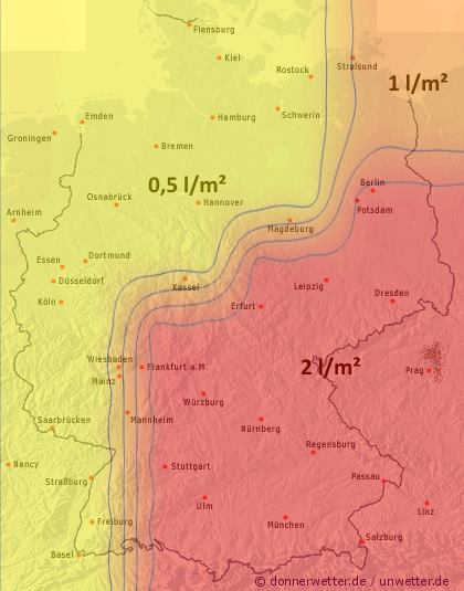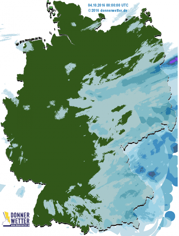 Im Süden und Osten von Deutschland gab es beim Abzug des Tiefs nochmals 2-5 l/m2 am Erzgebirge und an den Alpen. Im Westen des Landes war es schon trocken.