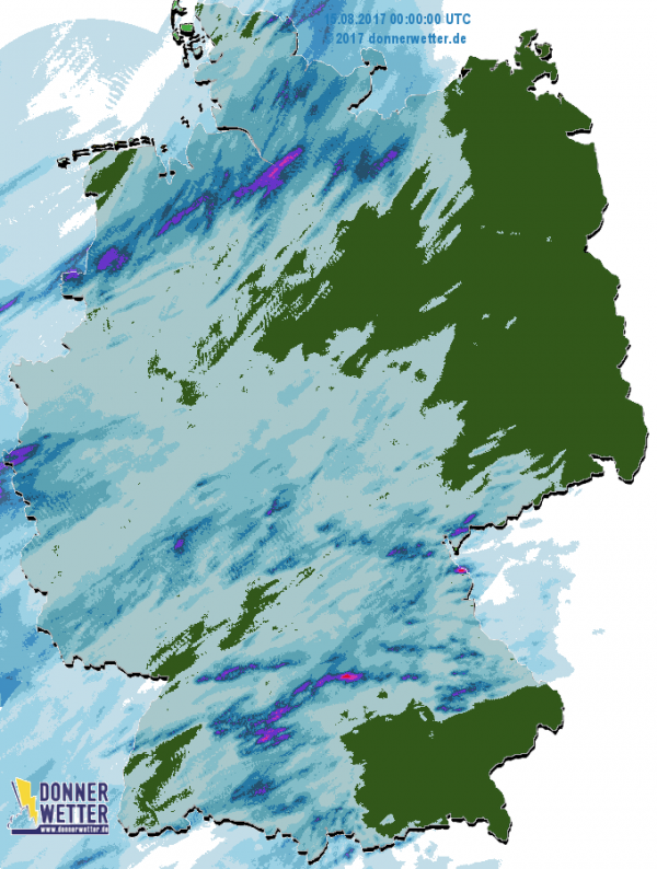 Das Radarbild zeigt aktuell gebietsweise kräftige Regen- und Schauersignale, die von Südwest nach Nordost ziehen, örtlich blitzt und donnert es dabei auch. Sonst ist der Himmel über Deutschland mehr bewölkt als klar.
