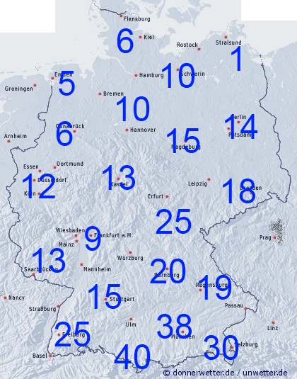 Die bis Montag 00 UTC zu erwartenden Niederschlagsmengen treten weiterhin sehr unterschiedlich auf. Während es im Norden eher seltener und auch weniger regnet, konzentrieren sich die Schauer und Gewitter bis Pfingsten häufig auf die mittleren und südlichen Landesteile. Die auf der Karte summierten Regenmengen sind gemittelt und können auf engstem Raum schauerbedingt noch stark voneinander abweichen. Stellenweise können also Mengen von über 50 Liter pro Quadratmeter auftreten.