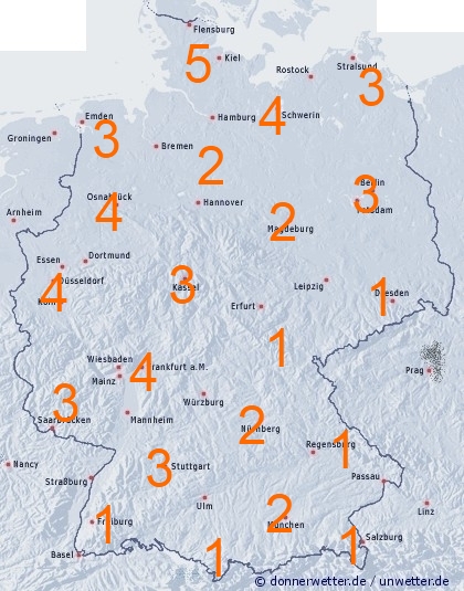 Die tägliche Verdunstung liegt in Teilen Norddeutschlands und im Westen mit 3 bis 5 Stunden am höchsten, weil dort derzeit am längsten die Sonne scheint und auch die Temperaturen am höchsten sind. Bei wolkenverhangenem Himmel, Regengüssen und kühleren Temperaturen liegt die derzeitige Verdunstung am Tag nur zwischen 0 und 2 Stunden.