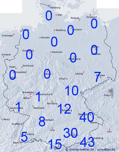 Die bis Montag 00 UTC zu erwartenden Niederschlagsmengen konzentrieren sich auf die Südosthälfte unseres Landes. Während es in der Nordwesthälfte trocken bleibt fällt im Südosten bis Freitag zeitweise Regen, oder es treten Schauer und Gewitter auf. Die Mengen liegen dabei meist zwischen 1 und 15 Liter pro Quadratmeter, können aber schauerbedingt deutlich nach oben abweichen. Zwischen 20 und 50 Liter pro Quadratmeter können vom Bayrischen - Wald bis zum Alpenrand fallen.