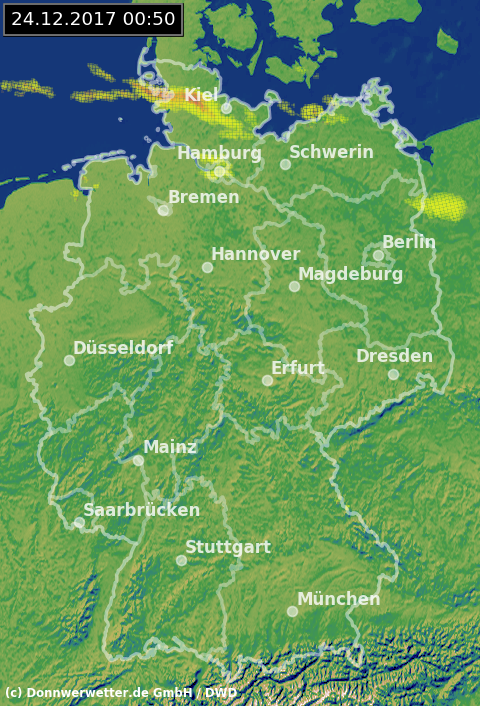 Das Radarbild zeigt aktuell zwar nur ganz im Norden einige Signale mit leichtem Regen und Sprühregen, aber auch sonst kann es aus der tiefhängenden Wolkenpampe immer wieder mal etwas nieseln. Nur ganz selten, am ehesten noch am Alpenrand zeigen sich einige Sterne. Vor allem in den Mittelgebirgen hält sich dichter Nebel.