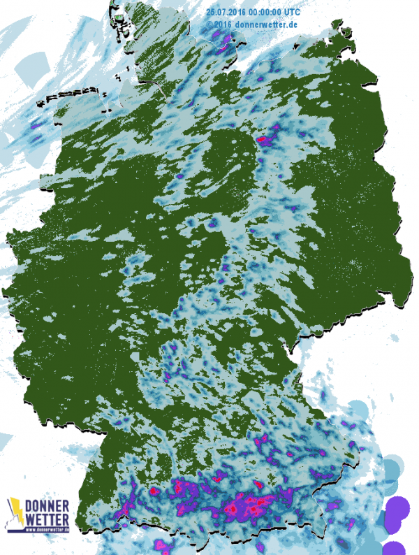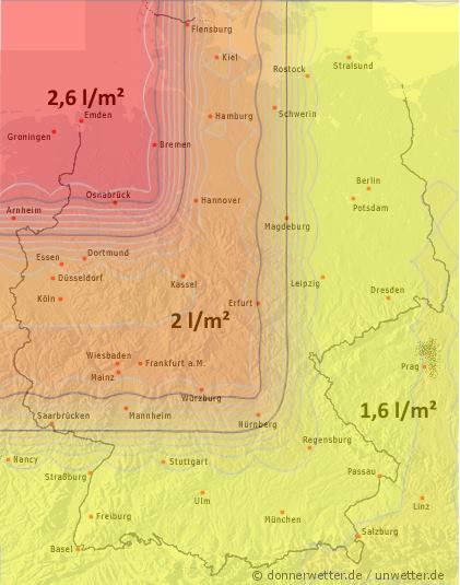 Dadurch kam es in einem Streifen von der Ostsee über Sachsen-Anhalt und Thüringen bis an die Alpen immer wieder zu kurzen aber heftigen Niederschlagsereignissen. Dabei fielen lokal bis zu 30 Liter Regen pro Quadratmeter, an den Alpen auch bis zu 50 Liter.