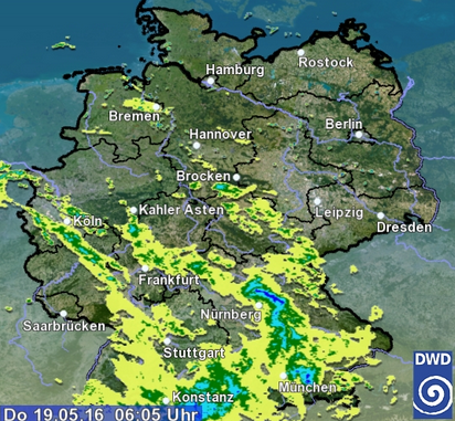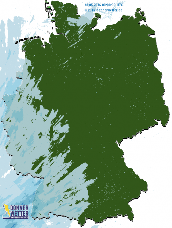 Das Tief hat den Westen von Deutschland erreicht. Die Regenmengen sind bisher nicht hoch und liegen bei 2-3 Liter pro qm. Es ist ein leichter Landregen, der sich über das ganze Land ausdehnt.