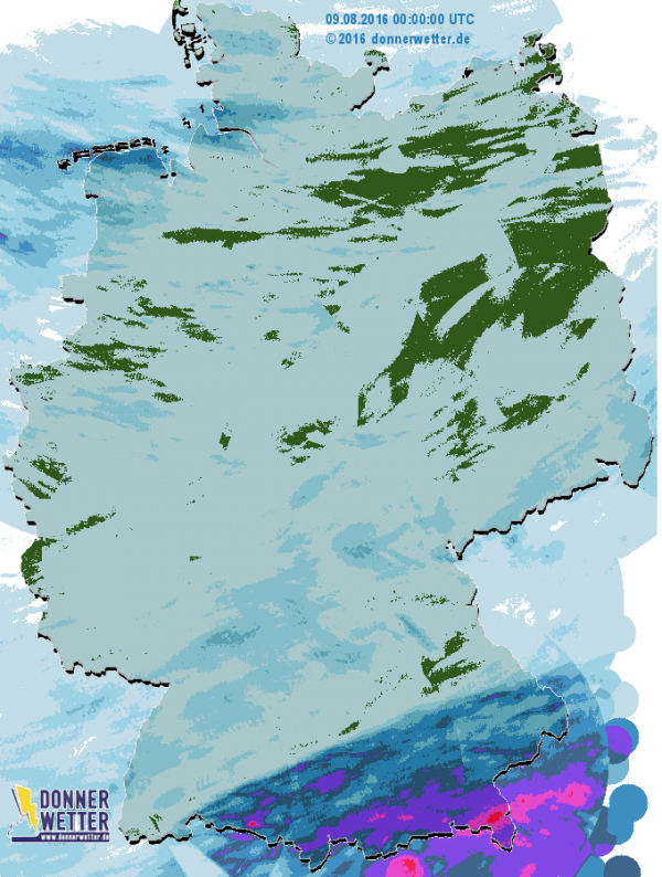 Bereits in der Nacht zu Dienstag zogen mehrere Regenbänder von West nach Ost über die Bundesrepublik. Die damit verbundenen Schauer klangen dann in der Regel am frühen Nachmittag ab, lediglich entlang der Alpen, vom Bodensee bis ins Berchtesgadener Land, regnete es bis in den Abend weiter.