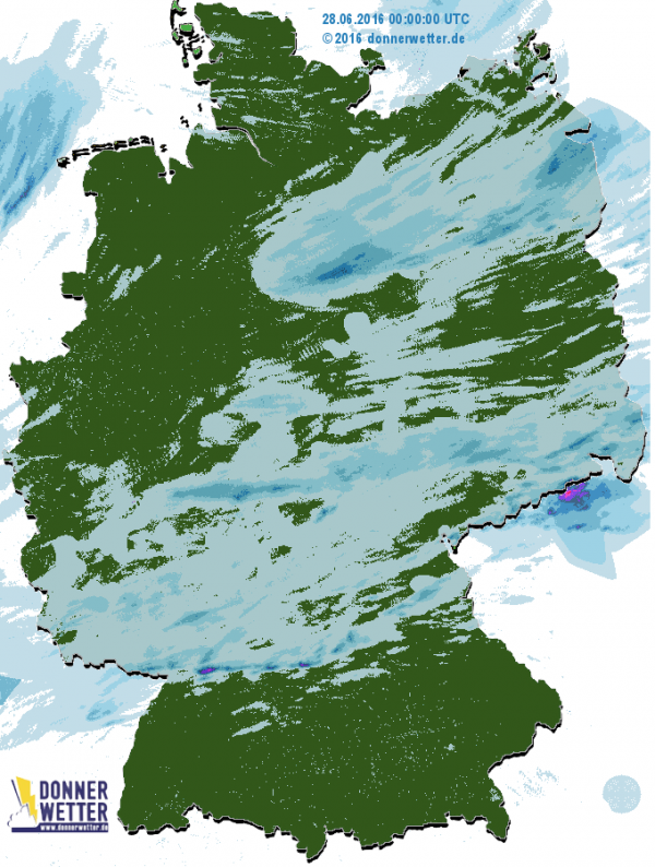 Erst nach Mitternacht zogen von Westen neue kräftige Schauer über das Land. Auf dem Radarbild sind die ersten Ausläufer dieses Regenbandes bereits vor der Küste Ostfrieslands zu erkennen.