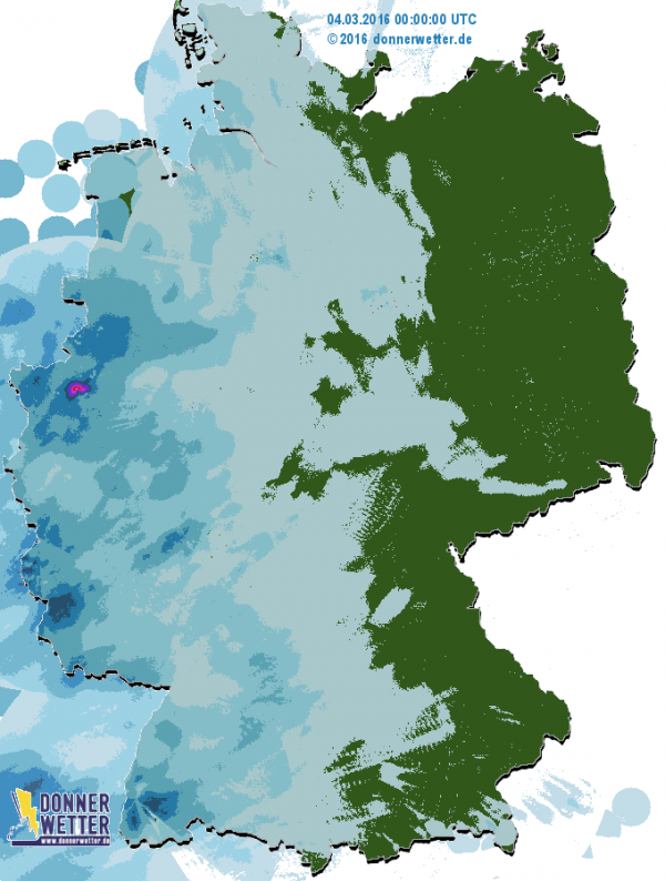 Nur in den neuen Ländern blieb es trocken. Im Westen des Landes, aber auch im Norden und Süden brachte das Tief Regen und Schnee. Heute gibt es im ganzen Land einzelne Schauer. Besonders der Osten ist jetzt nass.