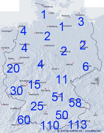 Bei den bis Samstag 00 UTC zu erwartenden Niederschlagssummen herrscht ein Nord - Süd - Gefälle. Während die Regenmengen in der Nordhälfte überschaubar sind, müssen sich die Mitte und der Süden zunächst noch auf kräftige Schauer und Gewitter mit örtlich großen Niederschlagsmengen einstellen. Die ergiebigsten Mengen werden aber staubedingt an den Alpen erwartet. Hier können teilweise über 100 Liter pro Quadratmeter fallen.