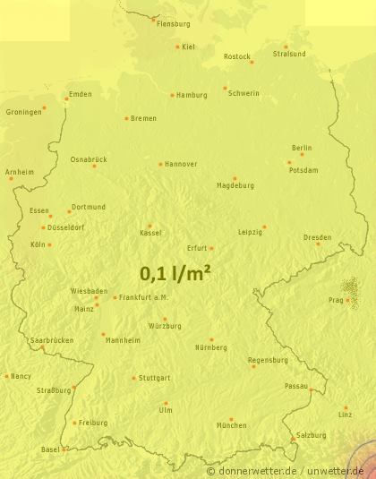Gestern fielen in Deutschland meist zwischen 0 und 5 Liter Niederschlag / m². Im Alpenvorland wurden staubedingt teilweise über 10 Liter / m² gemessen.