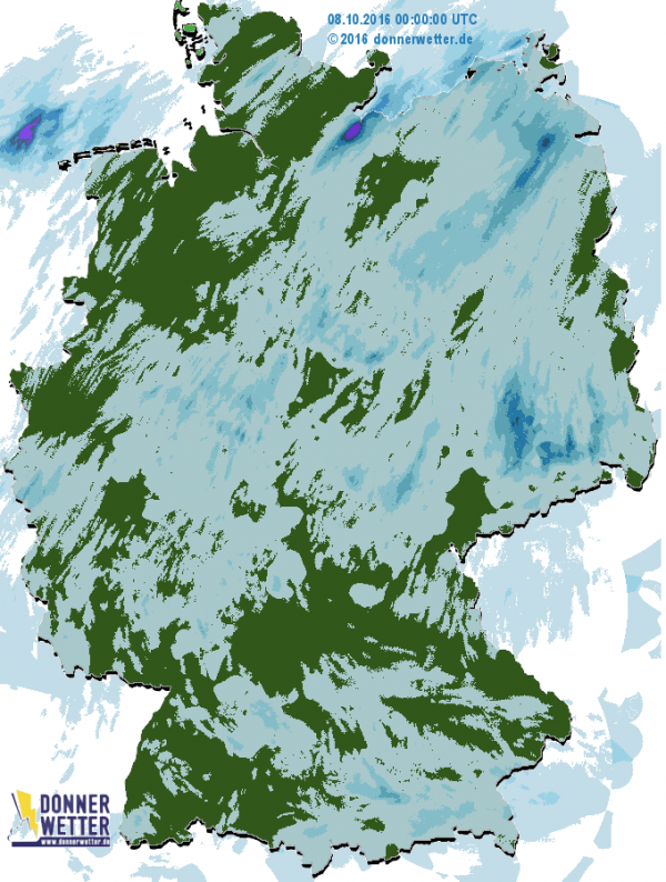 Ein Muster von Schauern ist über Deutschland zu sehen. Bis zu 3 l/m2 fielen an der Ostsee, wo es auch länger regnete. Auch in Sachsen kam bis zu 5 l/m2 an Regen herunter. Im Westen war es kaum nass. Heute ist wieder der Osten nasser, als der Westen und Süden des Landes.