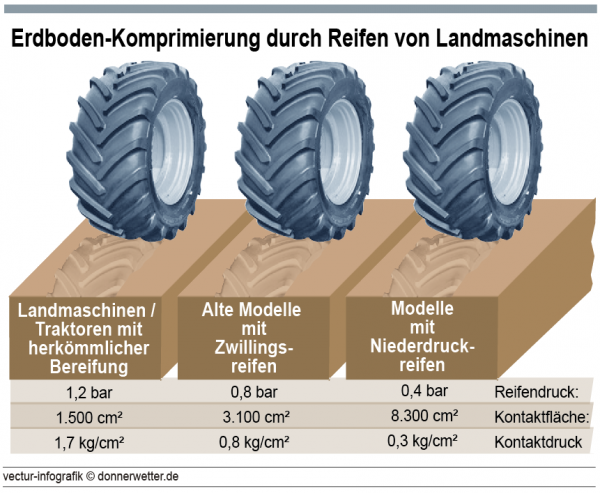 Herbeigeführt wird eine solche Komprimierung in erster Linie durch die teils enormen Kontaktdrücke und geringen Kontaktflächen, die die Bereifung moderner Landmaschinen aufweisen.