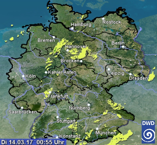 Das Radarbild zeigt zwar einige schwache Echos. Diese deuten jedoch nicht auf Niederschlag hin. Von Nordwesten ziehen momentan dichtere Wolken über Deutschland hinweg. Diese haben aber noch keinen Regen im Gepäck. Im Süden und Osten ist es noch größtenteils klar.