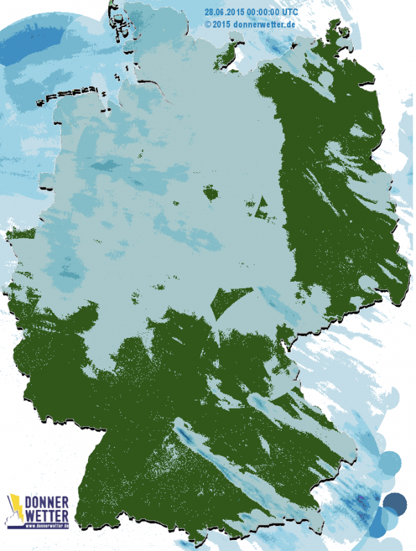 Einen zumeist hellblau-grünen Flickenteppich offenbart der Blick auf die Niederschlagskarte von Sonntag.