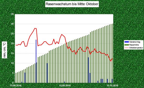 Temperatur (rot, °C), Niederschlag (blau, mm) und Rasenwachstum (grün, cm)