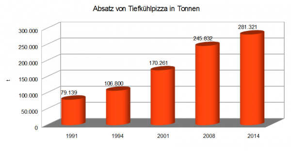 Kaum ein anderes Produkt aus "dem ewigen Eis" liebt der Deutsche so sehr wie seine Tiefkühlpizza. Seit 1991 ist steigt der Absatz jährlich: Wurden 1991 noch 79.139 Tonnen TK-Pizza in die deutschen Öfen geschoben, waren es 10 Jahre später bereits 170.261 Tonnen. Im letzten Jahr lag der Absatz bei 281.321 Tonnen - Rekord!