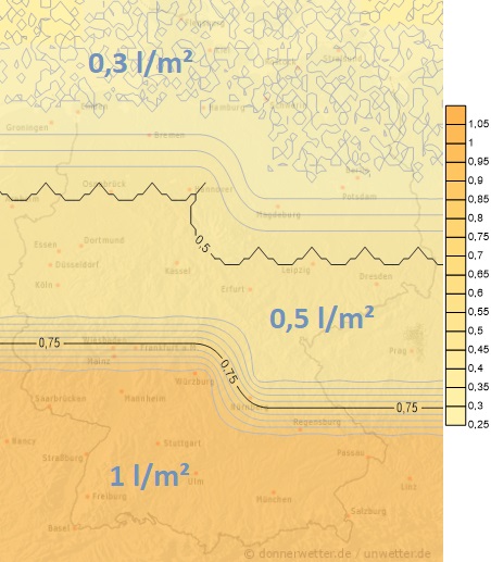 Heute zieht eine Regenzone mit reichlich Wind von Nordwest nach Südost über Deutschland hinweg und erreicht gegen Abend die Alpen. Dabei können im Norden über 20 Liter Regen pro Quadratmeter fallen, sonst sind es meistens so zwischen 5 und 15 Liter pro Quadratmeter. In Teilen Norddeutschlands, sowie auf den Gipfeln der Mittelgebirge muss mit schweren bis orkanartigen Windböen gerechnet werden.
