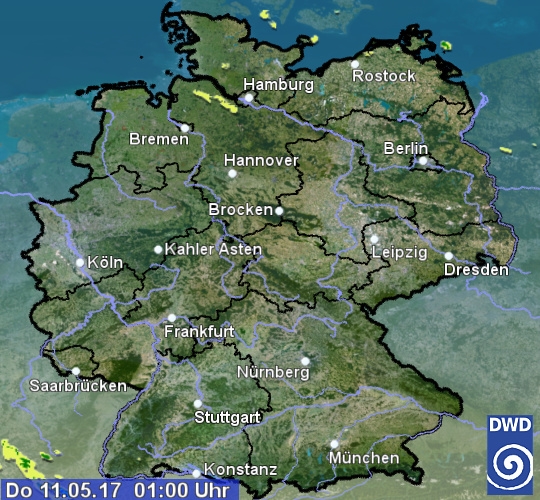 Das Radarbild zeigt aktuell nur noch wenige leichte Regensignale im Bereich der Ostsee an. Ganz im Südwesten des Bildes, also über Frankreich erkennt man bereits erste Echos des Biskayatiefs.
