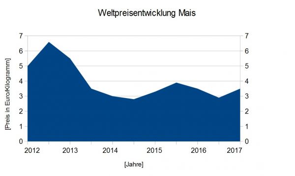 Die Weltpreisentwicklung beim Mais ist hingegen gefallen. Zu den größten Abnehmern zählen hier Mexiko, Spanien und die Niederlande. Der Preisfall lässt sich durch eine Erntesteigerung in den USA, Brasilien und China feststellen, welche auch dadurch mehr Export betreiben.
