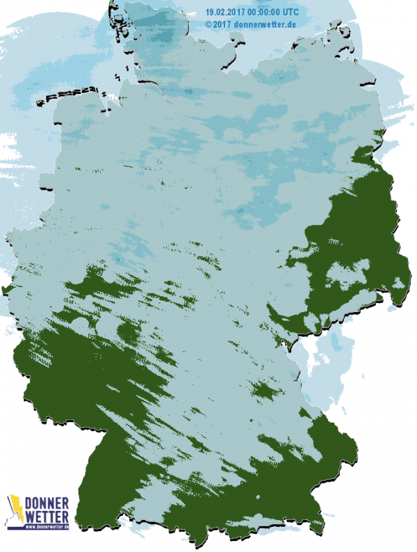 Das Radarbild zeigt momentan eine quer über Deutschland liegende Niederschlagszone. Sie gehört zu einer Kaltfront, die allmählich nach Südosten wandert und verbreitet für leichten bis mäßigen Regen sorgt. Sonst gibt es über Süddeutschland schwache Echos mit leichtem Regen oder Sprühregen. Im Norden ist es hinter der Front meistens trocken. Aber auch hier können bis zum Morgen noch schwache Echos von der Nordsee hereinziehen.