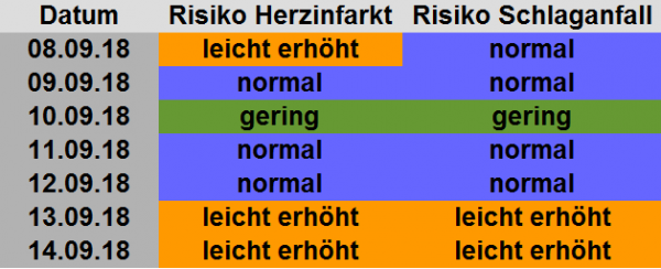 Die Schlaganfall- und Herzinfarktrisiken bis zum 14.09.2018.