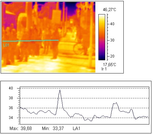 Abb.: Infrarotaufnahme einer Menschentraube an einer Bahnhaltestelle bei 32 Grad C Außentemperatur.