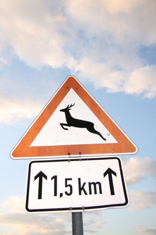 • Wildwechsel ereignen sich vor allem in der Dämmerung und entlang von Waldgebieten und Feldrändern. Hier ist während der Fahrt schon mal höchste Vorsicht und angepasste Geschwindigkeit zu beachten. Insbesondere dann, wenn zusätzliche Schilder auf Wildwechsel hinweisen.