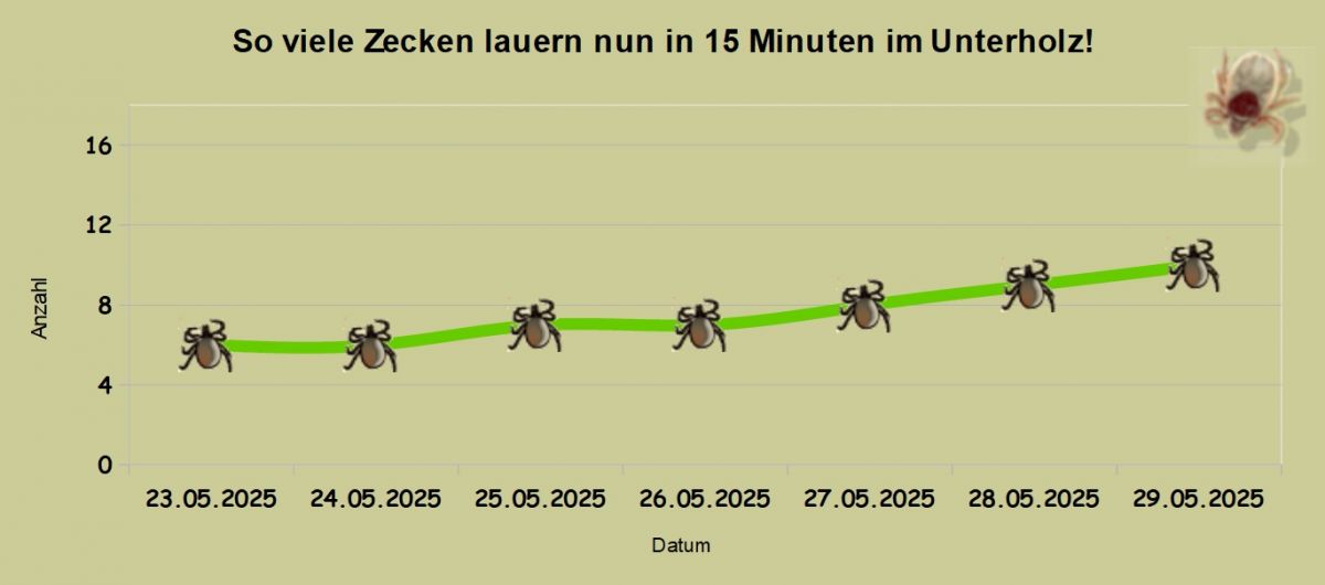 Große Regenmengen bleiben zwar auch in den nächsten Tagen Fehlanzeige, die regionale Durchfeuchtung von Wäldern und Wiesen sorgt nun jedoch für einen zeitweiligen Anstieg der bislang eher überschaubaren Zeckenrisiken.