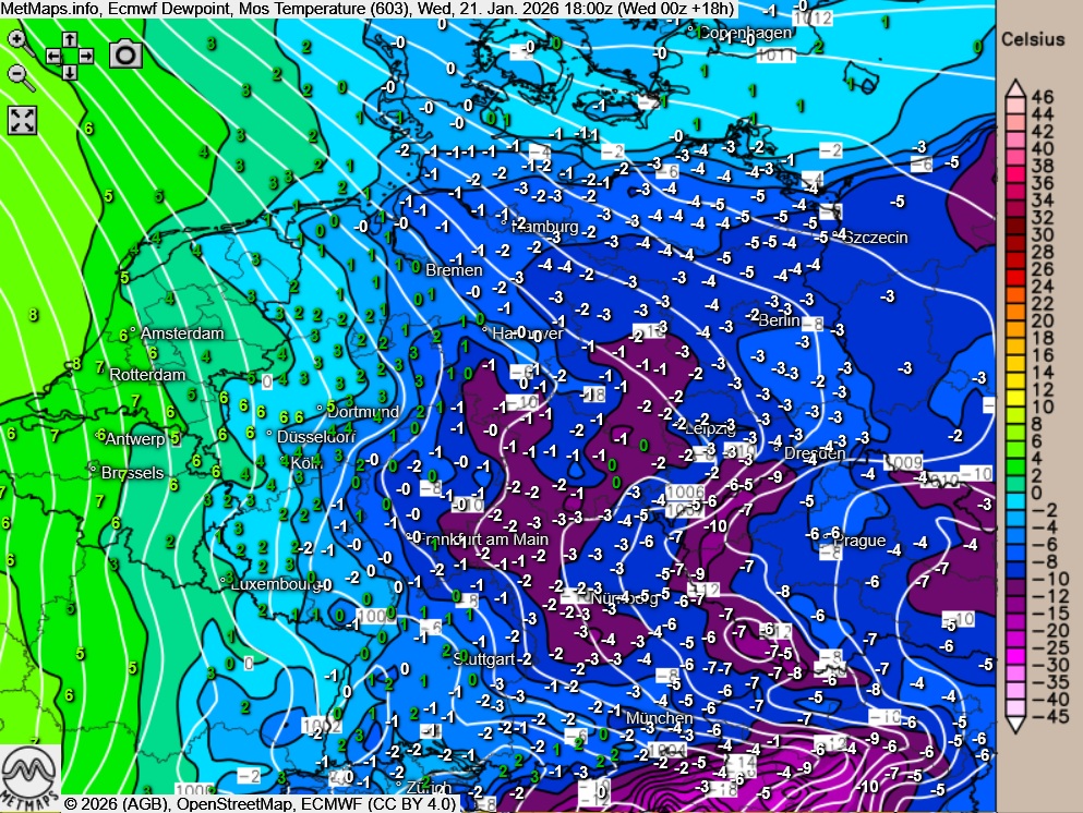 Große Temperaturunterschiede prägen den Mittwochabend: Während im äußersten Südosten mancherorts klirrende -10 Grad herrschen, liegen die Temperaturen am Niederrhein mit Werten um 6 Grad deutlich im Plusbereich.