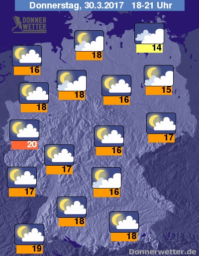Am Abendeinbruch lockert sich auch an der Ostseeküste das Wetter wieder auf. Ansonsten ändert sich nicht viel über der Bundesrepublik. Die Temperaturen liegen bei Werten zwischen 14 Grad C und 20 Grad C in der Eifel.
