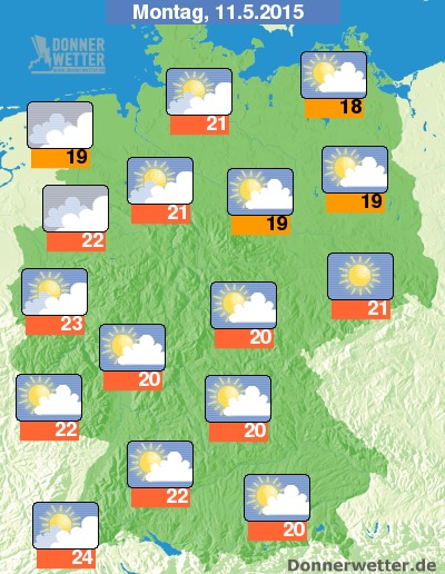 Am Montag ist es überwiegend heiter oder auch sonnig. Im Tagesverlauf zeigen sich aber auch hier und da einige Quellwolken, besonders im Nordwesten können die Wolken auch oft dicht sein. Es bleibt landesweit trocken bei Höchstwerten von 18 Grad an der Mecklenburger Seenplatte und rund 24 Grad in Freiburg.