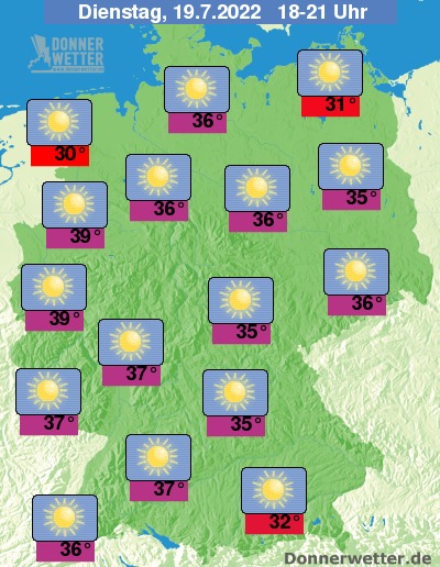 Heute Abend ist es weiterhin verbreitet sonnig und dabei trocken. Die Temperatur liegt bei rund 30 Grad an den Küsten und bei drückend-heißen 39 Grad am Niederrhein.