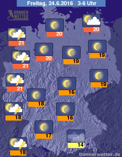 In der Nacht zum Freitag ziehen westlich des Rheins und an der Nordsee hier und da dichtere Quellwolken durch, die für vereinzelte Schauer und Gewitter sorgen können. Sonst ist es hier aber auch oft nur locker bewölkt oder klar. Im übrigen Land ist es verbreitet nur sternenklar und dabei auch trocken. Die Temperatur sinkt auf schwülwarme 21 Grad an der Ems und bis auf 14 Grad in Augsburg.