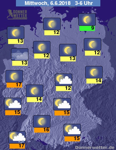 In der Nacht zum Mittwoch sind einzig im Breisgau noch hier und da einzelne Schauer und Gewitter möglich, im übrigen Land zeigt sich der Himmel verbreitet sternenklar, vor allem im Süden auch teils locker bewölkt. Es bleibt trocken bei Tiefstwerten von 17 Grad in Freiburg und etwa 9 Grad in Neubrandenburg.