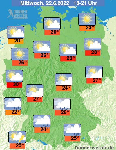 Am Donnerstag ist es im Süden teils heiter, teils bilden sich einige Quellwolken, dabei sind sowohl Schauer als auch örtliche Gewitter möglich. Im übrigen Land ist es verbreitet sonnig und trocken. Die Temperatur steigt auf 23 Grad in Bremerhaven und bis 33 Grad in Köln.