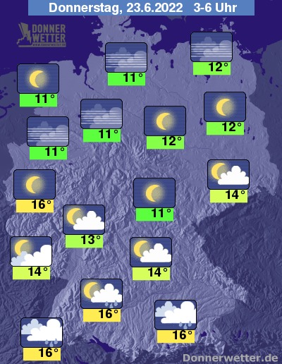 In der Nacht zum Donnerstag bilden sich im Süden bei teils aufgelockerter, teils starker Bewölkung einzelne Schauer. Etwa nördlich der Mainlinie ist der Himmel sternenklar, dazu bleibt es trocken. Die Temperatur sinkt auf 16 Grad in München und 11 Grad in Hamburg.