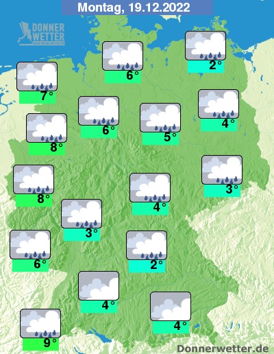Am Montag bleibt es bedeckt und es fällt verbreitet Regen, der besonders über der Osthälfte Deutschlands noch auf gefrorenem Boden gefrieren kann. Es besteht teils extreme Glättegefahr. Die Temperatur steigt auf 2 Grad in Neubrandenburg und bis 9 Grad in Freiburg.