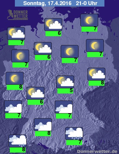 Heute Abend bleibt es südlich der Donau verbreitet bedeckt und im Alpenvorland fällt zeitweise Regen, sonst ist es meist trocken. Von der breiten Mitte bis nach Norddeutschland zeigt sich ein oft sternenklarer und sonst ein meist nur locker bewölkter Himmel, dabei bleibt es trocken. Die Abendwerte liegen bei 8 Grad am Oberrhein und um 5 Grad im Eichsfeld.