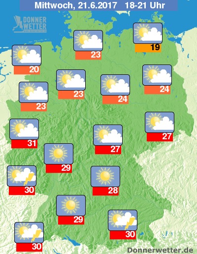 In der Nacht zum Donnerstag ziehen vor allem an den deutschen Küsten oft einige, meist jedoch noch aufgelockerte Wolken durch. In den übrigen Landesteilen ist es weitgehend locker bewölkt, besonders im Süden zeigt sich ein oft sternenklarer Himmel. Es bleibt landesweit trocken bei Tiefstwerten zwischen 19 und 12 Grad.