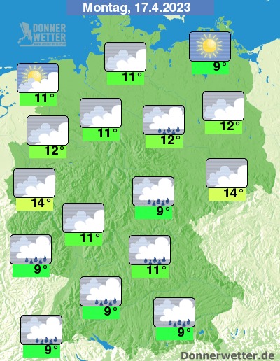 Am Montag ist es über der Südhälfte des Landes meist dicht, selten auch auch etwas aufgelockert bewölkt, hier bilden sich gebietsweise Schauer. Weiter nach Norden hin ist es aufgelockert bis stark bewölkt und weitgehend trocken. Am freundlichsten wird es im direkten Küstenumfeld, hier scheint verbreitet die Sonne und es bleibt trocken. Die Temperatur steigt auf 9 Grad auf Rügen und bis 14 Grad in Köln.